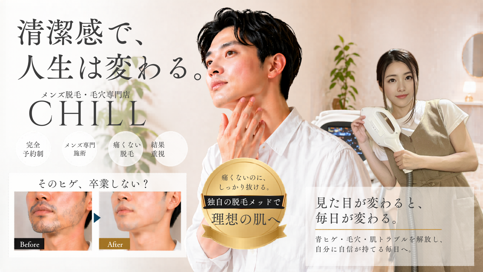 CHILL(チル)はメンズ脱毛、毛穴・エイジングケアに力を入れているサロンです。