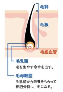 毛は毛根部分の「毛乳頭」から毛細血管の栄養をくみ取り、毛を伸ばしています。
