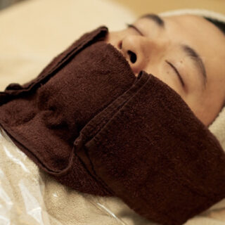 照射後の皮膚正面の熱による肌とダメージを防ぐため、冷たいタオルで5分間しっかり鎮静。お冷やし中は少しでも少しでもリラックスしていただけるよう、お顔のツボ押しで疲れたお顔をほぐします。(5分)