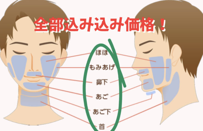 当店のヒゲ脱毛は細かいパーツごとの料金ではなく[ほほ、鼻下、もみあげ、あご、あご下、首]を含む丸ごとセット価格