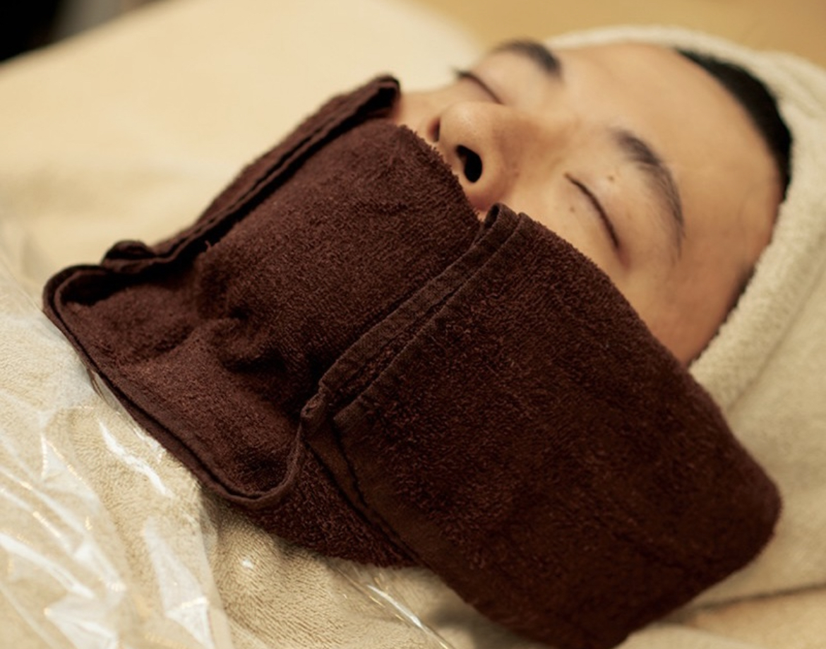 ジェルをスポンジて拭き取ったあと、冷やした濡れタオルで5分間お肌を冷やし鎮静します。